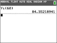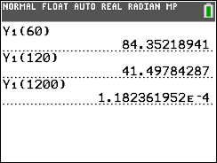 The calculator's exponential equation shows that the coffee will reach room temperature after 68.8 minutes.  This exponential graph is asymptotic to the x-axis, implying that the y-values (degrees) approach zero.  This can be seen by observing successively larger values substituted into the calculator's exponential equation (see home screen substitutions below).  Even though the graph approaches zero asymptotically, we know that the temperature of the coffee will stop cooling once it reaches room temperature of 76º, and will not continue following the curve of the graph.
