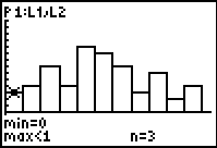 | 3. To see the histogram, press ZOOM and #9 ZoomStat. Press the TRACE key to see on-screen data about the histogram. The screen to the right shows the histogram developed directly from the ZoomStat choice of increments. Not so nice increments! |