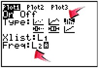 and choose #1 PLOT 1. You will see the screen at the right. Be sure the plot is ON, the histogram icon is highlighted, and that the list you will be using is indicated next to Xlist. When using a Frequency Table set Freq: L2 so that the number of times the data values appear will be determined by the numbers appearing in L2. |